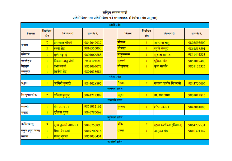 काठमाडौं । राष्ट्रिय स्वतन्त्र पार्टीले प्रत्यक्ष निर्वाचनमा विजय प्राप्त गर्न नसकेका क्षेत्रहरूको लागि समानुपातिक सांसदको सूचीबाट जिम्मेवारी तोकेको छ ।