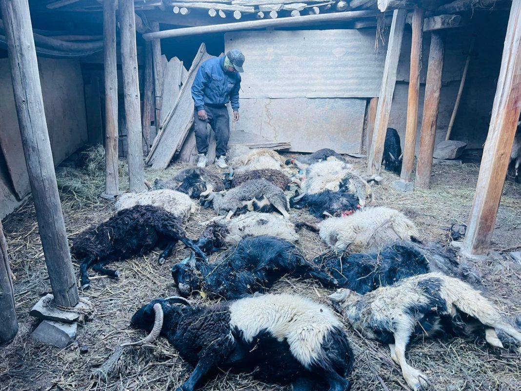मुस्ताङ । हिमाली जिल्ला मुस्ताङको घरपझोङ गाउँपालिका–२, मार्फास्थित सन्तोष परियारको गोठमा हिउँ चितुवा पसेर एकै रातमा ठूलो क्षति पुर्याएको छ।