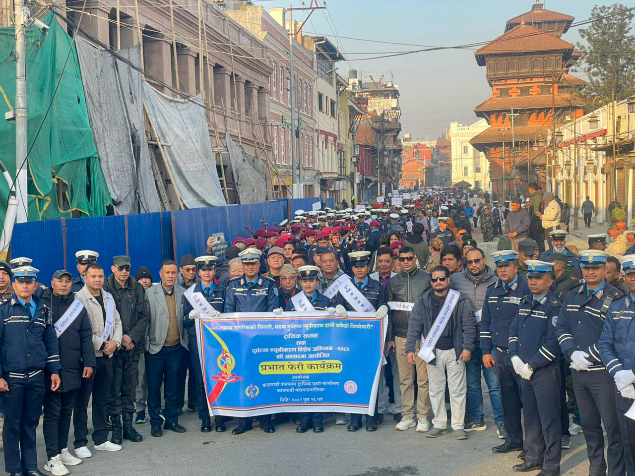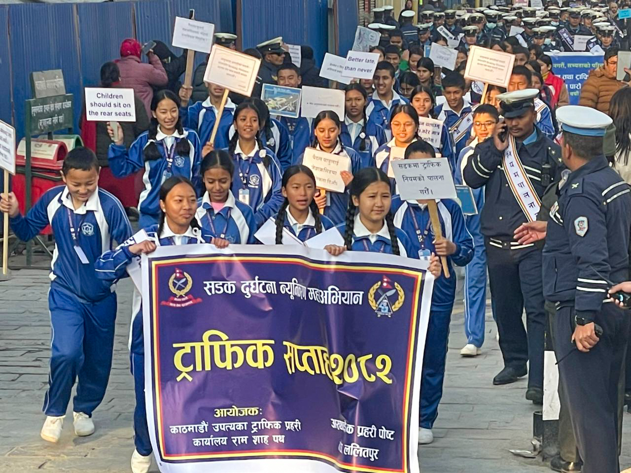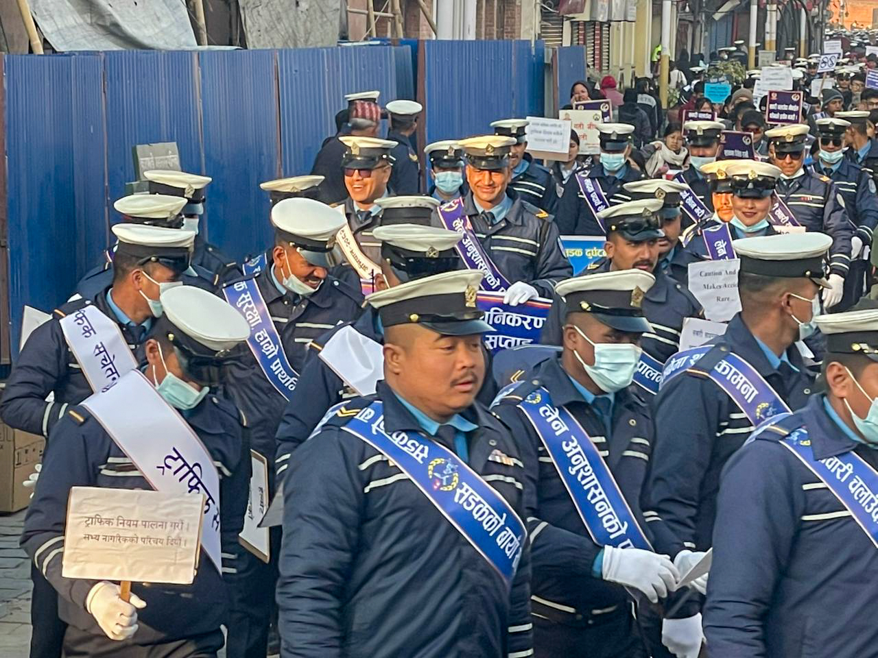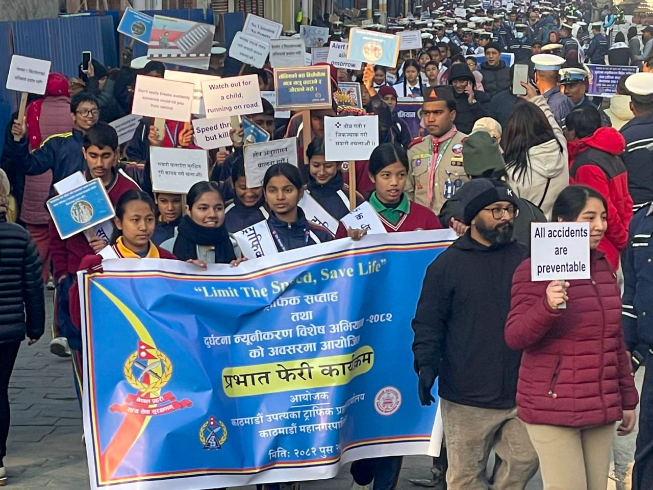 ‘अनावश्यक हर्न बजाई ध्वनी प्रदूषण नगरौं, सभ्यताको परिचय दिउँ’ भन्ने सन्देशसहित ‘दुर्घटना न्यूनीकरण विशेष अभियान तथा ट्राफिक सप्ताह २०८२’ को अवसरमा प्रभातफेरी कार्यक्रम आयोजना गरिएको छ । ‘ट्राफिक नियम पालना गरौं, दुर्घटनाबाट बचौं र बचाऔं’ भन्ने नारासहित आयोजित कार्यक्रममा सचेतनामूलक प्लेकार्डसहित सहभागीहरू सडकमा उत्रिएका छन् ।
