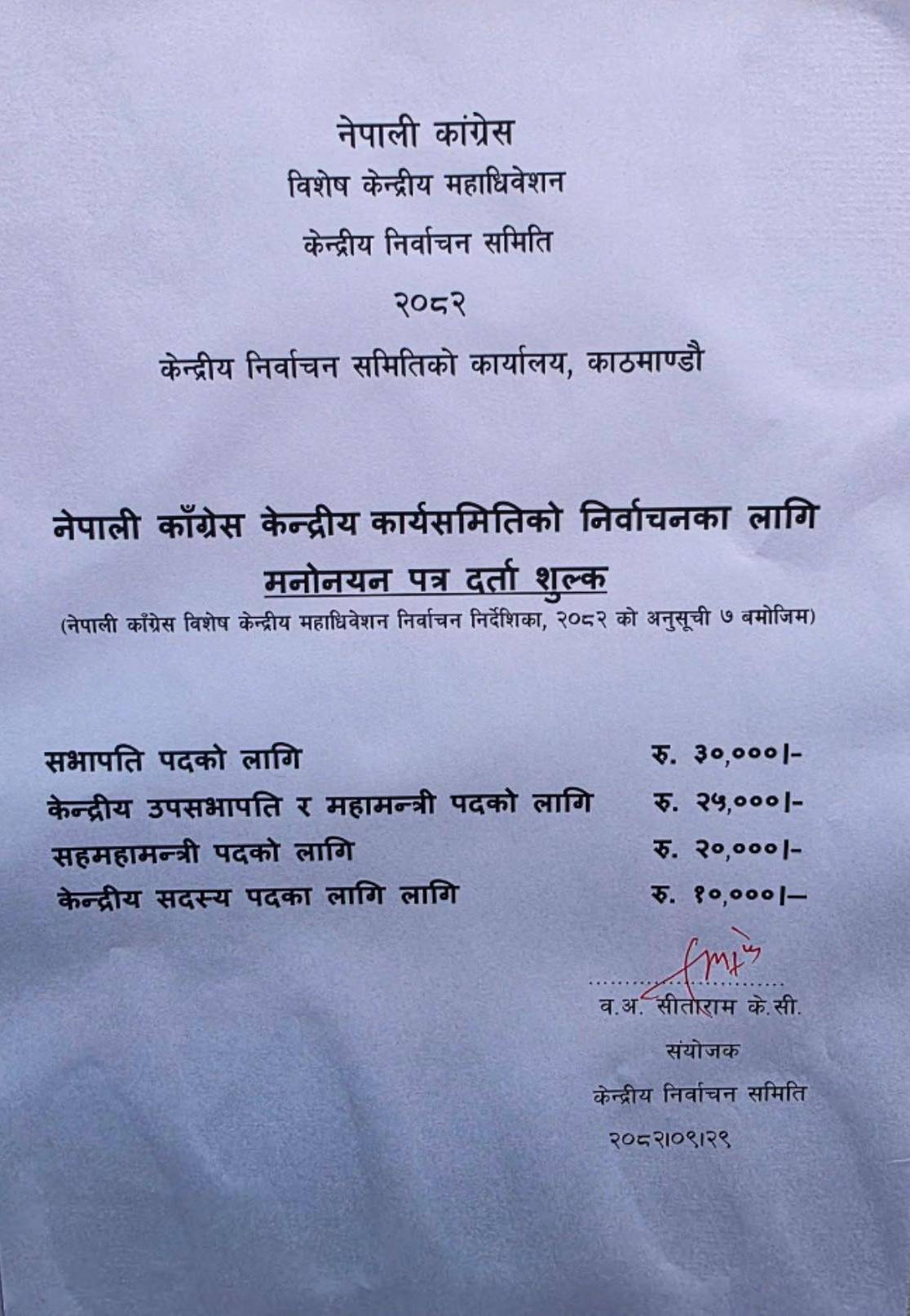 यसैगरी नेपाली कांग्रेसको विशेष केन्द्रीय महाधिवेशनअन्तर्गत केन्द्रीय कार्यसमितिको निर्वाचनका लागि मनोनयन पत्र दर्ता शुल्क समेत तोकिएको छ । केन्द्रीय निर्वाचन समितिले निर्वाचन निर्देशिका, ०८२ को अनुसूची–७ बमोजिम विभिन्न पदका लागि मनोनयन शुल्क निर्धारण गरेको हो ।