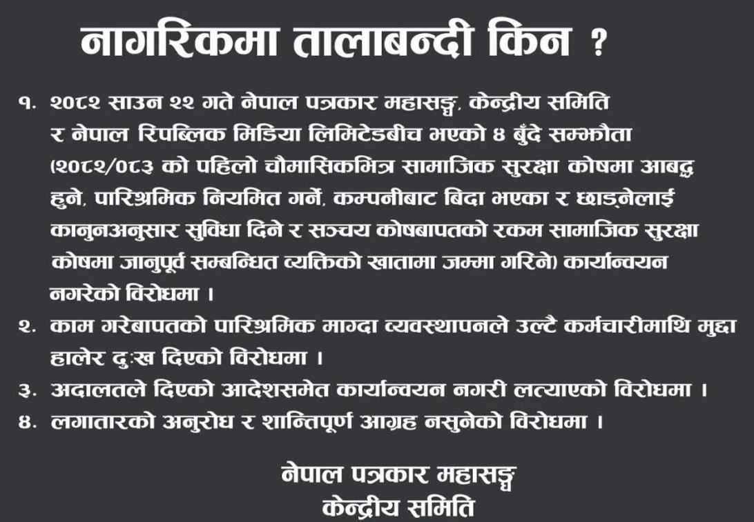 श्रमजीवी पत्रकारका न्यायोचित मागहरू पटक–पटक उठाउँदा पनि व्यवस्थापन पक्षबाट सुनुवाइ नभएपछि महासंघले बुधवार तालाबन्दी गरेको हो ।
