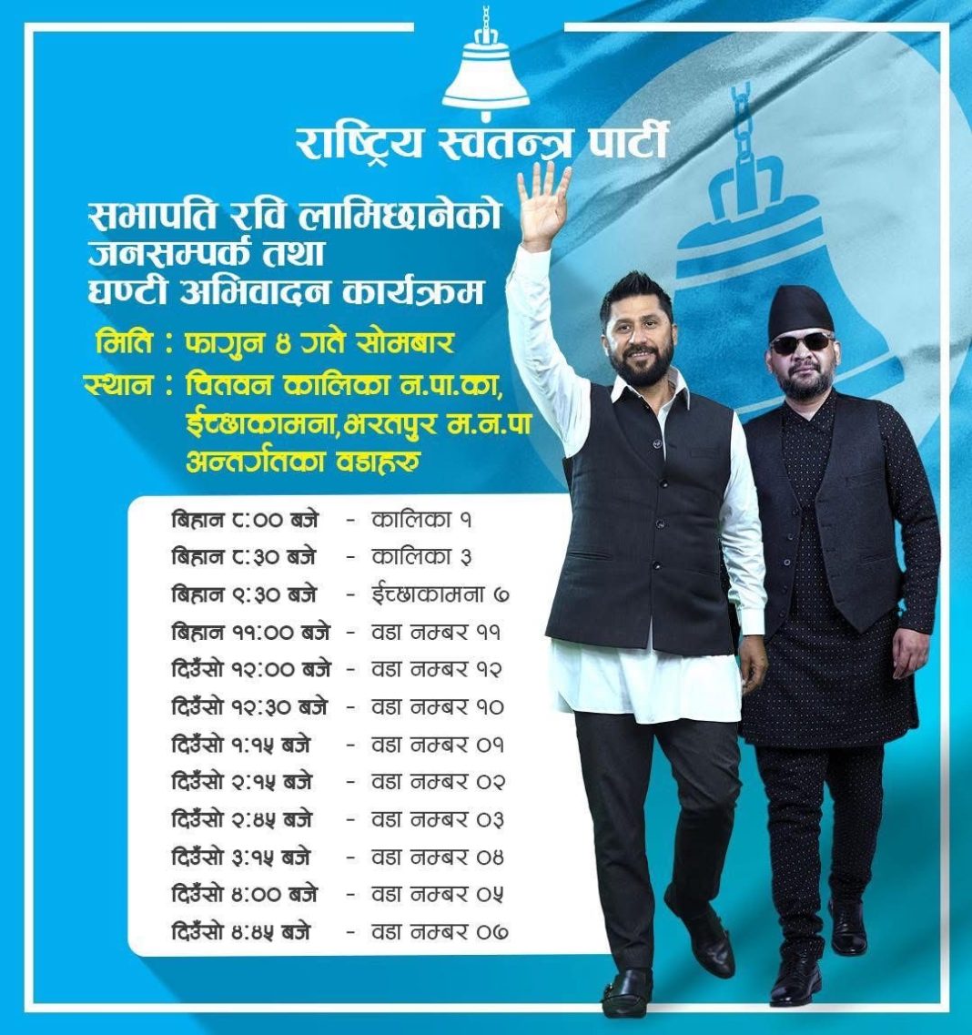​पार्टीले सार्वजनिक गरेको नयाँ कार्यतालिका अनुसार सभापति लामिछानेको दौडाहा बिहानैदेखि साँझसम्म चल्नेछ। कार्यक्रमको सुरुवात बिहान ८:०० बजे कालिका नगरपालिका वडा नम्बर १ बाट हुनेछ। त्यसलगत्तै उनी कालिका-३ र इच्छाकामना गाउँपालिकाको वडा नम्बर ७ मा पुग्ने तालिका रहेको छ।
