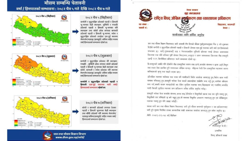 शुक्रबार दिउँसो कर्णाली र सुदूरपश्चिम प्रदेशका पहाडी तथा हिमाली क्षेत्रका एक-दुई स्थानमा भारी वर्षा र हिमपात हुने सम्भावना रहेको प्राधिकरणले जनाएको छ । प्राधिकरणले जोखिमबाट बच्न विशेष काम नपरी यात्रामा ननिस्कन र सुरक्षित स्थानमा आश्रय लिन सर्वसाधारणलाई अपिल गरेको छ।