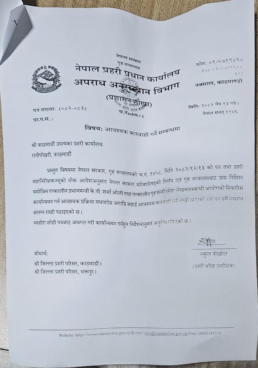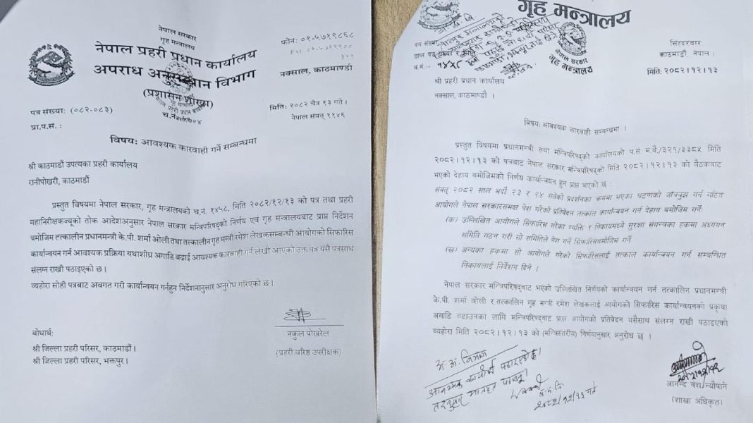 गृहले प्रहरी हेडक्वाटरमा पठाएको पत्रमा भनिएको छ, ‘नेपाल सरकार मन्त्रिपरिषद्बाट भएको उल्लिखित निर्णयको कार्यान्वयन गर्न तत्कालीन प्रधानमन्त्री केपी शर्मा ओली र तत्कालीन गृहमन्त्री रमेश लेखकलाई आयोगको सिफारिस कार्यान्वयनको प्रक्रिया अगाडि बढाउनका लागि मन्त्रिपरिषद्बाट प्राप्त आयोगको प्रतिवेदन यसैसाथ संलग्न राखी पठाइएको व्यहोरा मिति २०८२ चैत १३ गते को मन्त्रिस्तरीय निर्णय अनुसार अनुरोध छ ।’