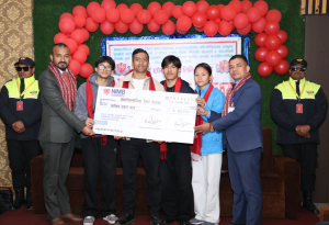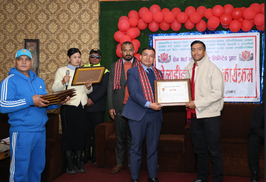 काठमाडौं । गत पुस २५ र २६ गते भारतको बैंगलोरमा सम्पन्न ‘ग्राउन्ड जिरो अन्तर्राष्ट्रिय क्यालिस्थेनिक्स प्रतियोगिता २०२६’मा स्वर्ण पदक विजेता खेलाडी र प्रशिक्षकलाई सेभ गार्ड फोर्सले नगद सहित सम्मान गरेको छ । बुधबार काठमाडौंमा आयोजित एक कार्यक्रममा सेभ गार्ड फोर्सका संस्थापक अध्यक्ष राजेश्वर थापा र मार्केटिंग म्यानेजर मनोज खड्काले पदक बिजेता खेलाडीहरु समर लामा ,ईसुरा राई र संगम अधिकारीलाइ रु ४० हजार नगद सहित सम्मान गरेका थिए ।